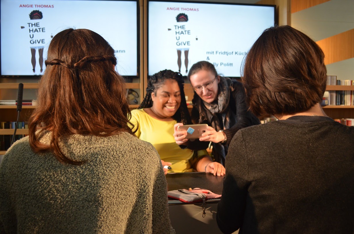 Nach einer kurzen Einführung von Fridtjof Küchemann lasen zunächst Angie Thomas, dann Nelly Politt die Szene, in der Kalil, der Freund der Protagonistin Starr von einem Polizisten in einer Kontrolle ermordet wird. Die Szene ist sehr emotional und ging von den beiden vorgetragen noch näher als beim Lesen.