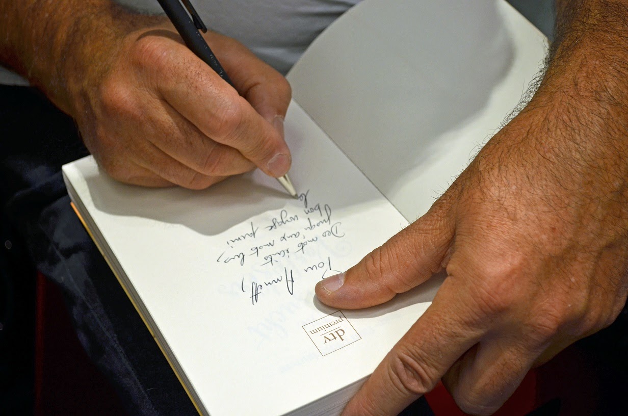 Da es mir immer unangenehm ist, wenn man schweigend in einer solchen Runde zusammensitzt und ich ja auch gerne ein paar direkte Worte an Jean-Paul Didierlaurent loswerden wollte, teilte ich ihm in einer Mischung aus fast vergessenem Schulfranzösisch in Kombination mit Englisch und Deutsch mit, dass ich den far breton aus dem Buch nachgebacken habe, meine Katzen diesen im Gegensatz zu dem Kater aus dem Buch jedoch nicht so gerne mögen. Da er in seiner Widmung in meinem Buch darauf einging, ist mein Französisch doch noch besser als gedacht ;)