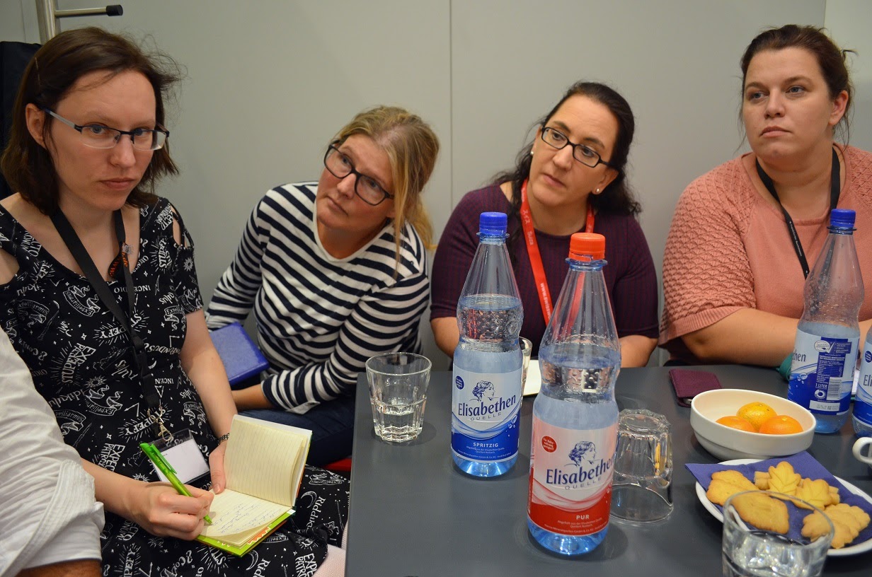 Wir saßen in einem recht kleinen Raum, dafür konnten wir uns untereinander aber wenigstens besser verstehen, als wenn wir an einem Tisch inmitten des dtv Standes gesessen hätten. Allerdings war es wiederum so eng, dass man hinter Frau Broller vom Verlag nicht mal mehr die Tür schließen konnte :’D