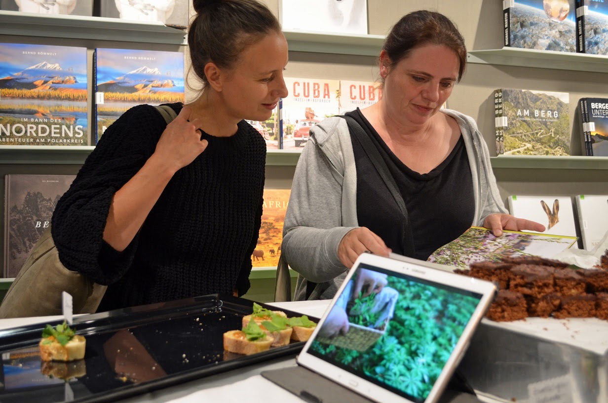 Den Mittwoch ließen wir bei Knesebeck ausklingen. Der Verlag hatte zur Party inklusive Buchvorstellung von „Die grüne Stadtküche“ eingeladen. Passend dazu gab es vegane Leckereien aus dem Buch. Die beiden sehr sympathischen Autoren Claudia Hirschberger und Arne Schmidt waren ebenfalls zugegen und beantworteten freundlich und kompetent alle Fragen zum Buch. Sehr interessant fand ich die Aussage, bewusst auf den Zusatz „vegan“ im Titel verzichtet zu haben, um ein breiteres Publikum anzusprechen, da viele wohl vor diesem Label zurückschrecken und gar nicht erst in ein Buch hineinblättern, wenn es als vegan angepriesen wird. Zudem hätten die beiden nicht mal bewusst nach veganen Rezepten für das Buch gesucht, es hat sich einfach so ergeben, dass am Ende alle Rezepte im Buch vegan waren.