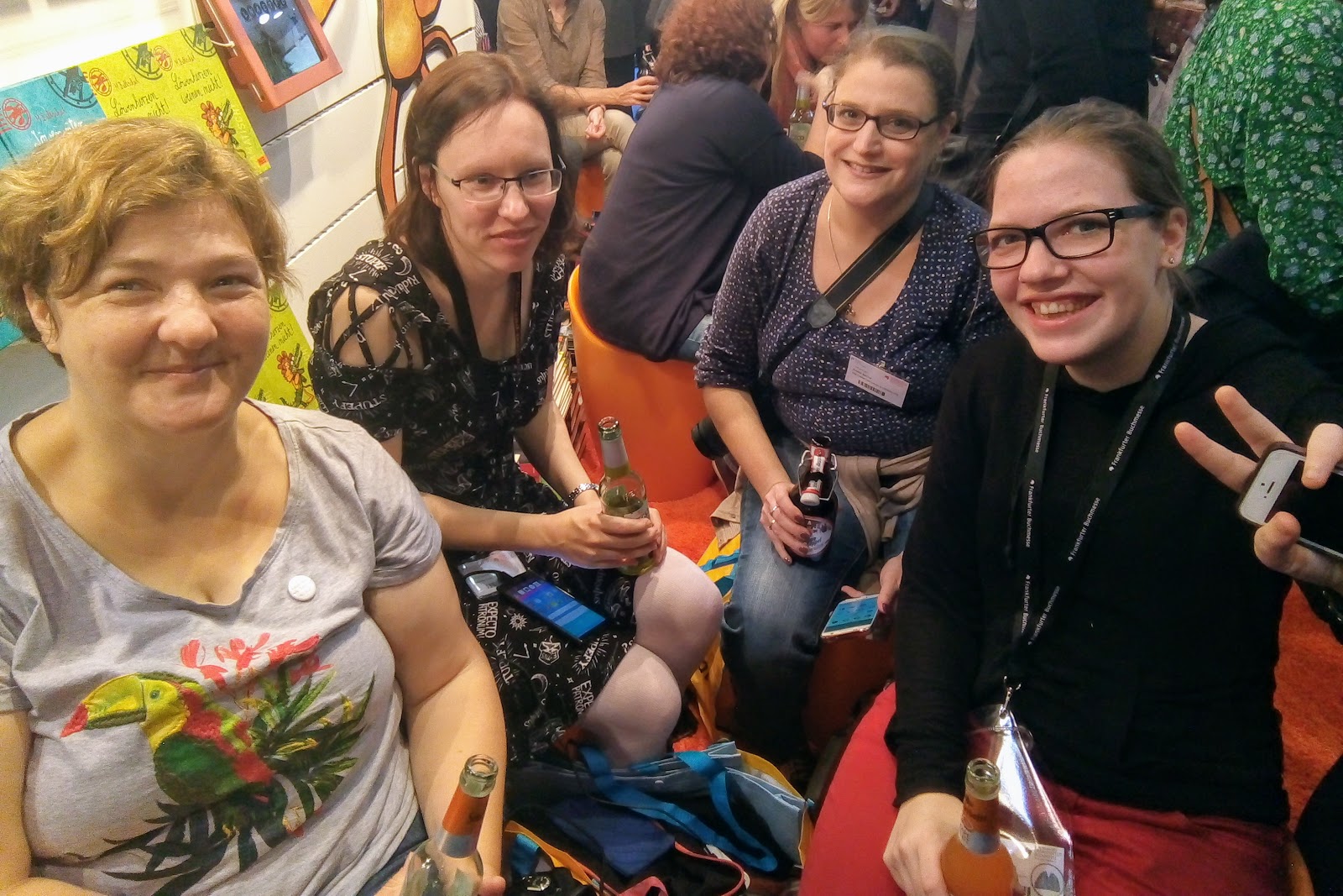 Unser Donnerstag fand seinen Abschluss, wie schon erwähnt, bei Beltz und Gelberg. Dieses Jahr stand die Feier unter dem Motto „Die hässlichen Fünf“, dem neuen Bilderbuch von Axel Scheffler und Julia Donaldson und die Band, die die Party musikalisch unternalte war wieder vom Feinsten! Dort trafen wir auch auf Anette von nettebücherkiste, die letztes Jahr leider nicht zur Messe kommen konnte. Wir haben zwar sehr unterschiedliche Leseinteressen und verbringen die Buchmesse auf völlig anderen Veranstaltungen, aber zumindest ein Treffen auf der Standparty von Beltz und Gelberg muss drin sein!