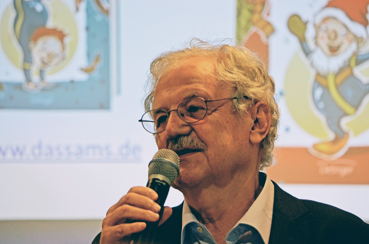 Paul Maar: Als Kind habe ich einen Menschen gekannt, der genauso war wie ich ihn dann als Herrn Taschenbier beschrieben habe. Er war sehr angepasst, sehr schüchtern und ein bisschen ängstlich, kontaktgestört. Er hätte nie von sich aus einen Erwachsenen angesprochen, nur zu Kindern hatte er einen Draht, zu mir war er sehr freundlich und er war auch derjenige der mich mal zur Seite genommen hat, anstelle meines Vaters kann man so sagen, der mich beiseite genommen hat und sagte „Paul, ich habe wieder deine neuen Bilder gesehen, ich gebe dir einen Rat, Du nimmst nicht das elterliche Geschäft, dass kann dein Bruder machen. Du musst unbedingt auf die Kunstakademie.“. Das habe ich dann auch getan. Und ich hätte diesem Menschen gerne als Kind mehr Lebensfreude vermittelt, aber das kann man als Kind natürlich nicht. Da sieht man nur „mein Gott, der ist immer so melancholisch“, aber wenn man dann ein erwachsener Autor ist, dann kann man den zum Leben erwecken und den Namen Taschenbier geben und genauso beschreiben wie dieser Mensch war und gibt ihm dann eine Gegenfigur, die als das verkörpert, was er nicht in sich selbst hat. Also: er ist schüchtern, dann muss die Gegenfigur frech sein. Er ist ängstlich, dann muss sie mutig sein. Er ist kontaktgestört, dann muss sie jeden anquatschen und wenn er so ein bisschen melancholisch ist, dann muss die Gegenfigur am meisten über seine eigenen Witze lachen und damit hatte ich schon die Gegenfigur. Jetzt musste ich ihr einen Namen geben. Da kam ich auf die sehr geniale Idee – ich muss das so nennen *alles lacht*, dass ich gewissermaßen die Figur nicht wie Pinocchio aus Holz schnitzen oder aus einer Mülltonne kommen lasse, sondern sie entsteht durch das Wort, gewissermaßen durch die Literatur selbst. Am Sonntag Sonne, Montag Herr Mohn, am Dienstag Dienst, Mittwoch Wochenmitte, Donnerstag Donner und Freitag Frei, da muss am Samstag das Sams kommen und da hatte ich schon den Namen und dann mussten wir nur noch das Äußere zurechtlegen, da haben mir meine Kinder etwas über die Schulter geschaut, „nee das nicht, das sieht zu sehr aus wie ein Alien, kannst du nicht das Kinn länger machen?“ bis die Kinder einverstanden waren und so war das Sams entstanden.